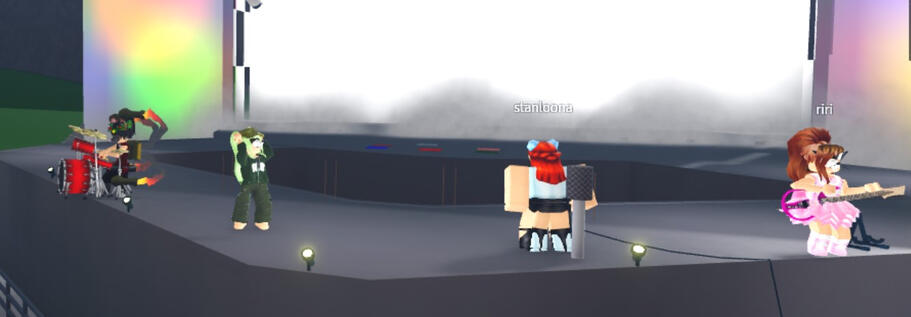 a pop-rock band with drummer aro, dancer anne, vocalist lex, guitarist ellie.